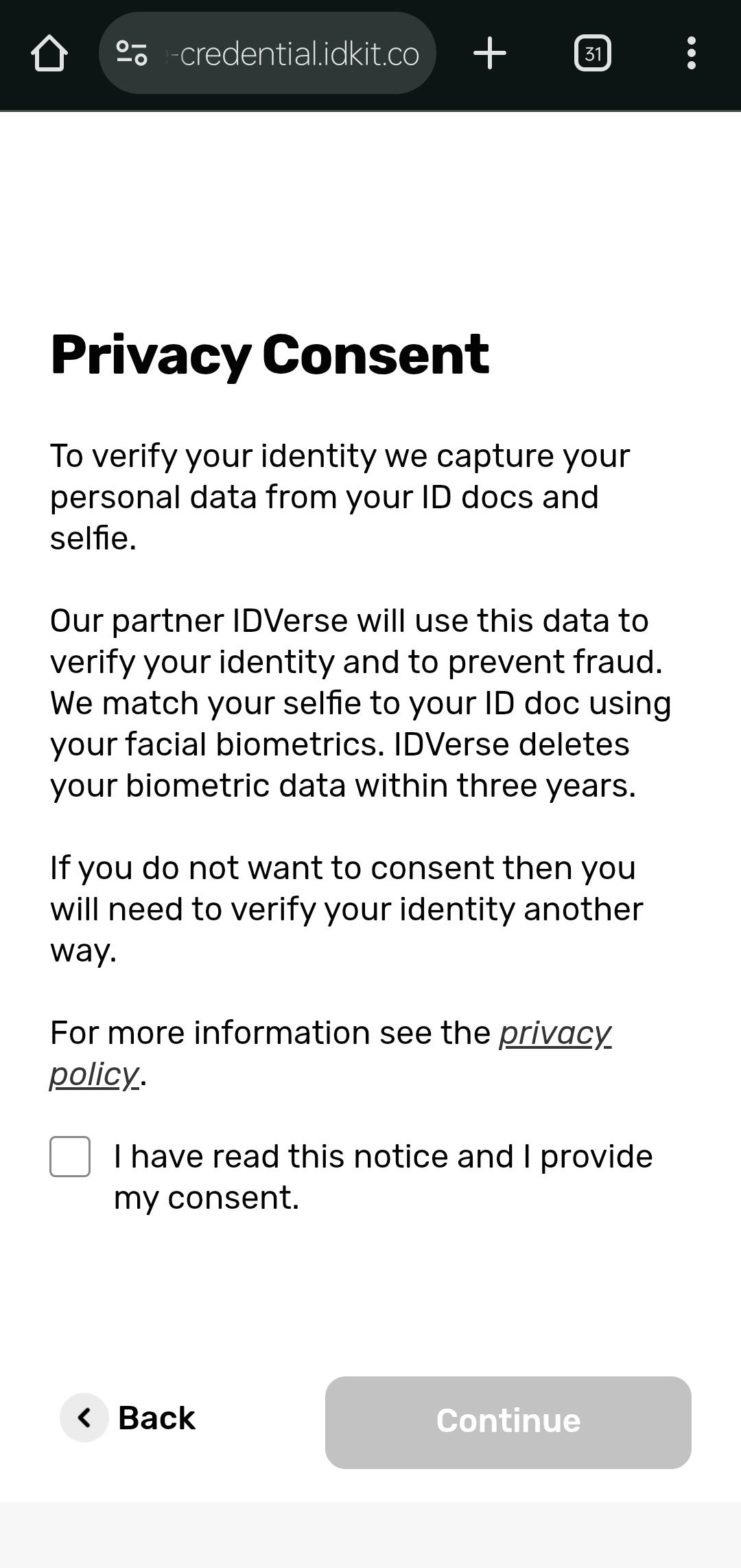 Review the privacy consent information about data collection and usage. Click "Continue" to accept the terms and proceed to identity verification.